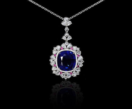 陈世英作品 Wallace Chan 红宝石首饰 Ruby Jewelry 蓝宝石首饰 Sapphire Jewelry 猫眼首饰 Cat's Eye Jewelry 祖母绿首饰 Emerald Jewelry 设计类首饰 Design 16.99 Carat Cornflower Blue Sapphire Set In 18K Gold Pendant18K white gold pendant mounted with superior quality diamonds. The center stone is a 16.99 carat Sir Lankan cornflower blue sapphire.16.99克拉矢车菊蓝宝石吊坠18K白金吊坠,镶高品质钻石及16.99克拉主石,斯里兰卡产矢车菊蓝宝石。